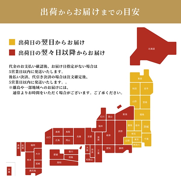 代金のお支払い確認後、お届け日指定がない場合は5営業日以内に発送いたします。後払い決済の場合は注文確定後、5営業日以内に発送いたします。