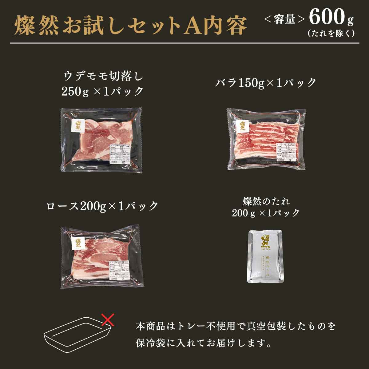 | セット内容 | 燦然お試しセットA ウデ・モモ切り落とし/250g×1パック バラしゃぶしゃぶ用/150g×1パック ロースしゃぶしゃぶ用/200g×1パック 燦然のたれ/200g×1パック |