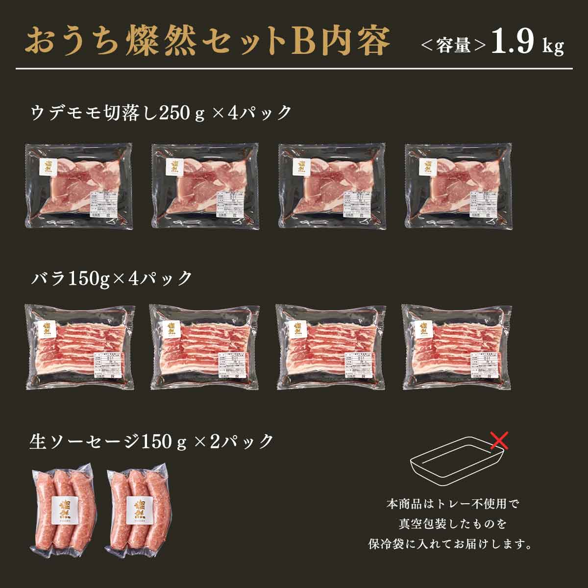 | セット内容 | ウデ・モモ切り落とし/250g×4パック バラしゃぶしゃぶ用/150g×4パック 生ソーセージ/50g×3本×2パック |