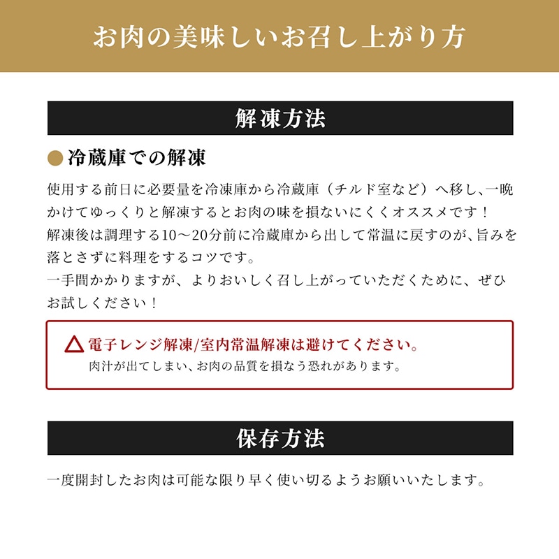 | 解凍方法 | 使用する前日に必要量を冷凍庫から冷蔵庫(チルド室など)へ移し、一晩かけてゆっくりと解凍するとお肉の味を損ないにくくオススメです! 解凍後は調理する10~20分前に冷蔵庫から出して常温に戻すのが、旨みを落とさずに料理をするコツです。 |