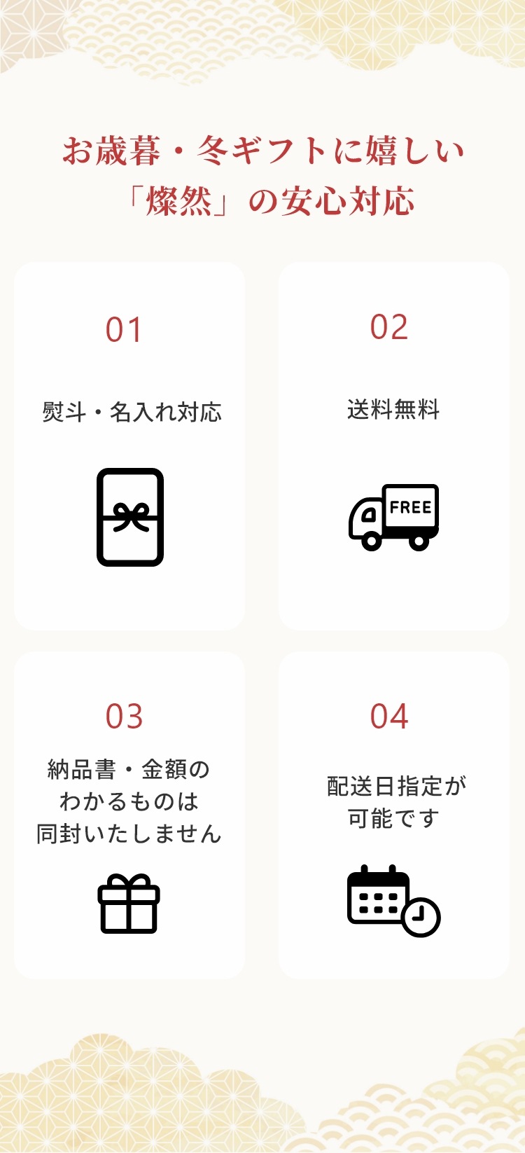 しっかり伝わりましたお歳暮用にお世話になっている上司へ贈りました。届いたその日に「とても美味しかったよ!」と喜びの連絡をいただき、こちらまで嬉しくなりました。梱包や熨斗の対応も丁寧で、贈る側としても安心感がありました。また別の方にも贈りたくなる、そんな品質と気配りでした。